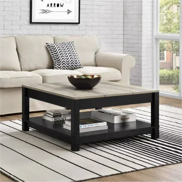 Our coffee table is ingeniously crafted to suit both aesthetic and practical needs. The matte black finish, complemented by the distressed woodgrain top, offers a refined and clean look, seamlessly fitting into any home decor. Whether you’re looking to showcase decorative items or seeking a convenient spot to organize magazines and remotes, this coffee table meets all your needs with its elegant design and multi-level storage option.