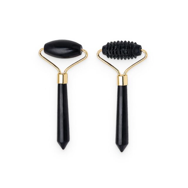 The set includes two obsidian facial rollers. The smooth roller reduces puffiness and inflammation, while the spiked one stimulates the lymphatic system by setting stagnant blood into movement.
