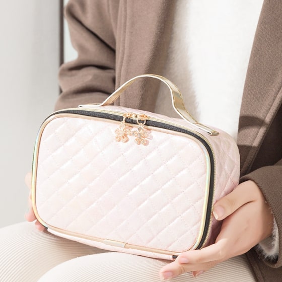 I was a little anxious about the bag quality but it’s by far the best makeup bag I've ever used! It’s great quality, perfect size for regular use as well as for travelling. Beautiful pink color and durable material. It perfectly fits all my girl stuff and has convenient slots for brushes. It’s worth the money. I definitely recommend it.